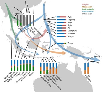 Locations and best-fit mixture proportions for Austronesian-speaking and other populations, with possible directions of human migrations, from “Reconstructing Austronesian population history in Island Southeast Asia” Nature