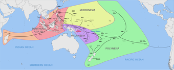 Austronesian people settlements extend from Taiwan and maritime Southeast Asia to parts of mainland Southeast Asia, Micronesia, coastal New Guinea, Island Melanesia, Polynesia, and as far as Madagascar. They also include indigenous minority groups in Vietnam, Cambodia, Myanmar, Thailand, Hainan, the Comoros, and the Torres Strait Islands. Countries and regions where Austronesian speakers form the majority are often referred to collectively as Austronesia. [Source: Wikipedia]