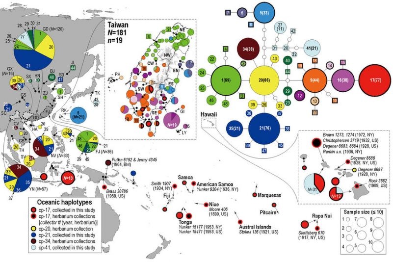genetic structure of paper mulberry trees from across Asia and Oceania is consistent with the theory that Taiwan is the ancestral homeland of the Austronesian-speaking peoples, 2016 (Graphics courtesy of Chung Kuo-fang)