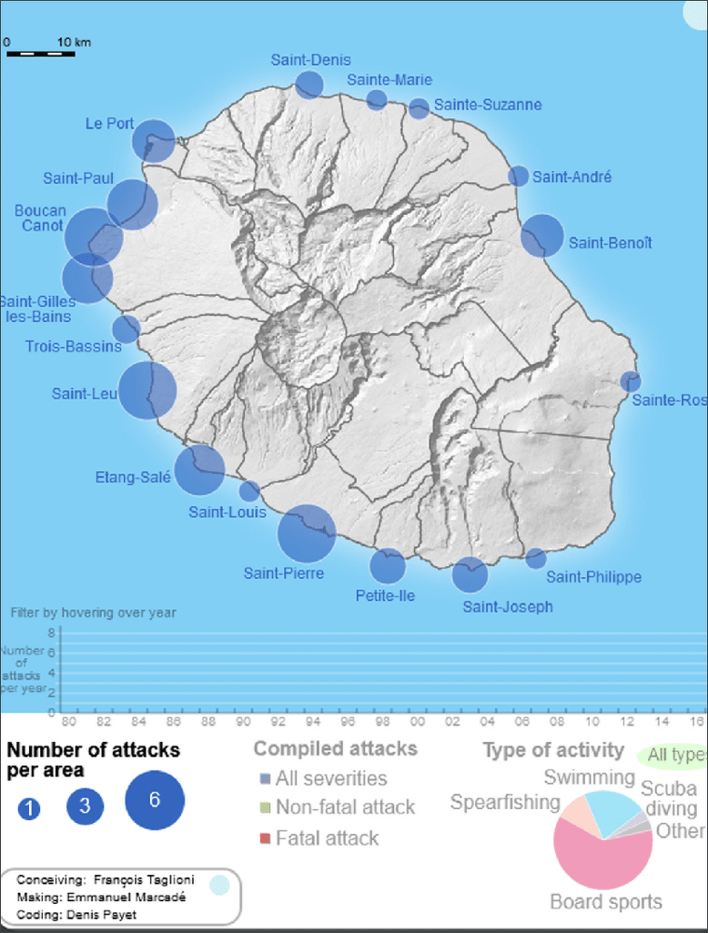 shark attacks in Reunion. [Source: Researchgate, “A spatial and environmental analysis of shark attacks on Reunion Island (1980–2017)} by François Taglioni, Sebastien Guiltat, Magali Teurlai, Payet Denis, Marine Policy, March 2019, This paper analyses data related to the 57 shark attacks that were recorded on Reunion from 1980 to 2017]