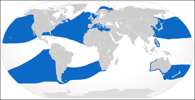 Basking sharks have a wide geographic range and are most commonly found in temperate and waters in northern latitudes. In the Northern Pacific Ocean, they have been spotted off the coasts of Japan and coast of China. In North Atlantic Ocean and the Arctic Ocean, they have been observed off coasts of Ireland and Britain, the North Cape of Norway and off the coast of Russia. In the Southern Hemisphere, basking sharks have been reported off the coasts of South Africa and Brazil and the southern Atlantic Ocean.