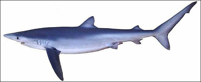 Blue shark are cold blooded (ectothermic, use heat from the environment and adapt their behavior to regulate body temperature) and heterothermic (have a body temperature that fluctuates with the surrounding environment). They reach lengths of four meters (13 feet), with their average length being 3.35 meters (11 feet). They reach weights of 240 kilograms (530 pounds). Females are larger than males.[Source: Alexandra Axtell and Joseph Boucree, Animal Diversity Web (ADW) /=]