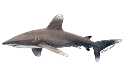 Oceanic whitetip sharks reach lengths up to 3.3 meters (11 feet). They are large, pelagic (open ocean) sharks found in tropical and subtropical oceans throughout the world. Around the U.S. they are seen around New England, the Mid-Atlantic, Pacific Islands, the Southeast and West Coast They live offshore in deep water, and spend most of their time in the upper part of the water column near the surface. Oceanic whitetip sharks are long-lived, late maturing, and have low to moderate productivity.[Source: NOAA]