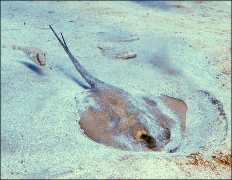 Round stingrays appear to spend most of their time partially buried in the sand, or, for a few species, lying on rocks or among sea vegetation. They flap their pectoral fins to bury themselves with sand, and also to uncover the benthic (bottom-dwelling) organisms on which they feed. If stepped on they can thrust their flexible tails upward to deliver a sting with their tail spines. [Source: Monica Weinheimer, Animal Diversity Web (ADW) /=]