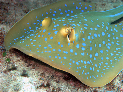 According to Animal Diversity Web: The tail of Bluespotted ribbontail ray can be easily recognized by the blue side-stripes found on either side. It has large spiracles that lie very close to its large eyes. The mouth is found on the underside of the body along with the gills. Within the mouth are two plates, which are used for crushing the shells of crabs, prawns, and mollusks. Propulsion is achieved using its pectoral fins which make up the bulk of its oval, disc shaped body. Blue-spotted stingrays have fin muscles which are found throughout the entire length of the fin. All of these muscles are active except at low speeds when they are not needed to propel the body through water. /=\