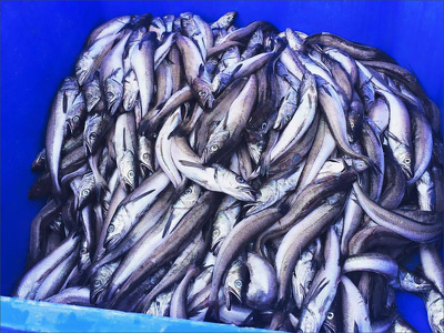 There are three stocks of Pacific whiting: 1) a migratory coastal stock, ranging from southern Baja California to Queen Charlotte Sound; 2) a central-south Puget Sound stock; and 3) a Strait of Georgia stock. While the latter stocks have declined substantially, the coastal stock remains large and healthy and is the most abundant commercial fish stock on the Pacific Coast. Pacific whiting are night-time predators that move up the water column to feed and then migrate back down during the day. [Source: NOAA]