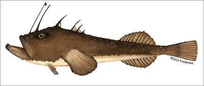 Monkfish is the name are various species of lophiid anglerfishes found in the Atlantic and Indian Oceans. Members of the genus Lophius, they sometimes called monkfish, fishing-frogs, frog-fish, and sea-devils. They look ugly but taste good. The mostly fished and eaten monkfish in the U.S. is the American angler (Scientific name: Lophius americanus). Also known as goosefish, monktails, angler, allmouth, molligut, abbot and lotte, they have mottled dark brown to olive-green skin on top and whitish skin underneath. They are described as tadpole-like in appearance, with a body that is mostly a broad head with a large mouth and a narrow, tapering body. [Source: NOAA]