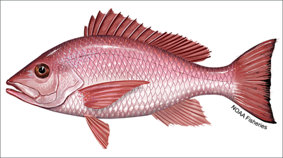 Northern red snapper (Scientific name:Lutjanus campechanus) have a spiny dorsal fin and are light red with darker, deep red coloring on their back. Also known as snapper, genuine red snapper, american reds, spot snapper, they have enlarged canine teeth, which is why they are called “snappers.” Their jaws are equal, with the lower one sometimes slightly projecting. Red snapper in deeper waters tend to be redder than those caught in shallower waters. They have a long triangular face with the upper part sloping more strongly than the lower. In the U.S. they can be found off Southeast. [Source: NOAA]