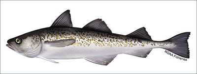 Haddock (Scientific name: Melanogrammus aeglefinus) are a member of the cod family, but they are smaller than Atlantic cod. They have dark lateral lines across their bodies and have distinguishing black blotch "thumbprints" between the line and pectoral fin on each side of their body. Their skin is also less mottled than cod.Also known as scrod, haddock weigh between one and three kilograms (2 and 7 pounds) and are 30 centimeters to one meter (1 to 3 feet) in length at maturity. Their lifespan is 10 or more years although scientists typically catch haddock that are between 3 and 7 years old. [Source: NOAA]