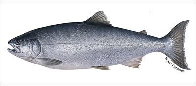 Chinook salmon (Scientific name: Oncorhynchus tshawytscha) are blue-green on the back and top of the head with silvery sides and white bellies when they’re in the ocean. Also known as king salmon, spring salmon, tyee, winter, quinnat and blackmouth, they have black spots on the upper half of the body and on both lobes of the tail fin. and have a black pigment along the gum line, thus the nickname "blackmouth."[Source: NOAA]
