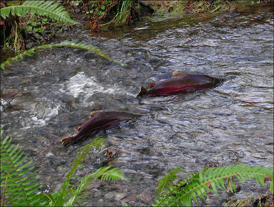 Pacific salmon and steelhead have a dynamic life cycle that includes time in fresh and saltwater habitats. These fish are born in freshwater streams and rivers, migrate to coastal estuaries, then enter the ocean where they mature. They usually return as adults to the same streams where they were born to spawn and begin the cycle again. [Source: NOAA]