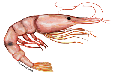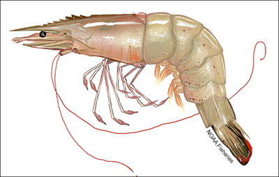 Pink shrimp (Scientific name: Farfantepenaeus duorarum) are also known as spotted shrimp, hopper, pink spotted shrimp, brown spotted shrimp, grooved shrimp, green shrimp, pink night shrimp, red shrimp, skipper, pushed shrimp. They typically have a dark-colored spot on each side between their third and fourth abdominal segments. Their tail usually has a dark blue band (rather than the purplish band found on brown shrimp). Part of their shell is a well-developed, toothed rostrum that extends to or beyond the outer edge of the eyes. [Source: NOAA]