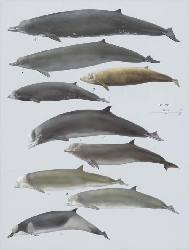 1) Baird’s Beaked Whale (Berardius baiwrdu), 2) Arnoux’s Beaked Whale (Berardius arnuxu), 3) Cuvier’s Beaked Whale (Ziphius cavirostris), 4) Northern Bottlenose Whale (Hyperoodon ampullatus), 5) Southern Bottlenose Whale (Hyperoodon planifrons), 6) Shepherd’s Beaked Whale (Tasmacetus shepherd), 7) Longman’s Beaked Whale (Indopacetus pacificus), 8) Hubbs’s Beaked Whale (Mesoplodon carlhubbsi), 9) Stejneger’s Beaked Whale (Mesoplodon stejnegeri), 10) Pygmy Beaked Whale (Mesoplodon peruvianus), 11) Perrin’s Beaked Whale (Mesoplodon perrini), 12) True’s Beaked Whale (Mesoplodon marus), 13) Strap-toothed Whale (Mesoplodon layardii), 14) Hector’s Beaked Whale (Mesoplodon hectori)