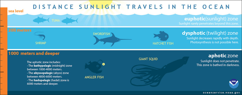 The ocean is divided into three zones based on depth and light level. 1) The upper 200 meters of the ocean is called the euphotic, or "sunlight," zone. This zone contains the vast majority of commercial fisheries such as tuna and is home to many protected marine mammals and sea turtles. 2) The zone between 200 meters and 1,000 meters is usually referred to as the “twilight” zone, but is officially the dysphotic zone. In this zone, the intensity of light rapidly dissipates as depth increases. Such a minuscule amount of light penetrates beyond a depth of 200 meters that photosynthesis is no longer possible. ‘Photic’ is a derivative of ‘photon,’ the word for a particle of light.