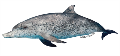 Atlantic spotted dolphins are 1.5 to 2.3 meters (5 to 7.5 feet) in length and weigh 100 to 143 kilograms (220 to 315 pounds), with an average weight of around 90 kilograms (200 pounds). Females tend to be slightly larger than the males. These dolphins have a robust body with a tall, curved dorsal fin located midway down their back. Their beaks are moderately long. Like other dolphin, their head has a distinctive melon, a rounded forehead that collects sounds from the environment. They have 30 to 42 pairs of small, cone-shaped teeth, 3-5 millimeters in diameter, in each jaw. Atlantic spotted dolphins generally have distally broader rostrum (beak) and fewer but larger teeth than Pantropical spotted dolphins. At times differentiating between these two spotted dolphins is difficult, especially in areas where they converge geographically. [Source: NOAA]