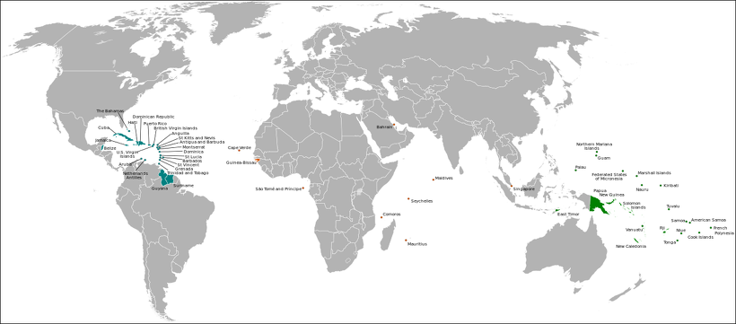 Member states: Atlantic Ocean (3 countries): Cabo Verde, Guinea-Bissau, São Tomé and Príncipe; Caribbean (16 countries): Antigua and Barbuda, Bahamas, Barbados, Belize, Cuba, Dominica, Dominican Republic, Grenada, Guyana, Haiti, Jamaica, Saint Kitts and Nevis, Saint Lucia, Saint Vincent and the Grenadines, Suriname, Trinidad and Tobago; Indian Ocean (4 countries): Comoros, Maldives, Seychelles, Mauritius; Pacific Ocean (15 countries): Cook Islands, Fiji, Kiribati, Marshall Islands, Federated States of Micronesia, Nauru, Niue, Palau, Papua New Guinea, Samoa, Solomon Islands, Timor-Leste, Tonga, Tuvalu, Vanuatu. South China Sea: Singapore