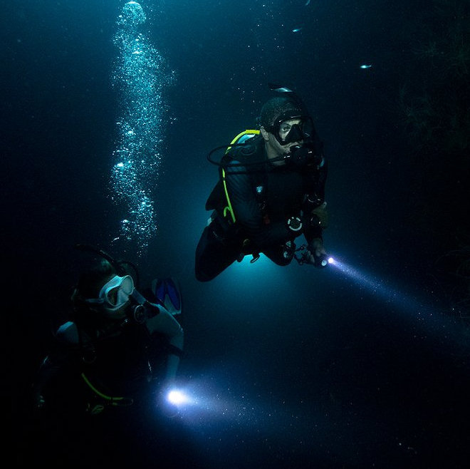 One of the attractions of night diving is that you can see a variety of flora and fauna that you generally can’t see during the day. Many creatures come out of hiding and comes alive in the dark. Even if you have been to a dive site several times during the day, exploring it at night opens up a whole new world. Divers often witness bioluminescence, the natural light produced by glowing organisms. To help them safely navigate in the dark, divers bring along bright underwater flashlights. The main risk associated with night diving is becoming disoriented and getting lost and losing contact with other divers and the dive boat.[Source: Cala Mia Island Resort, December 13, 2019]