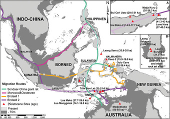 Four possible migration routes of early modern humans from Southeast Asia to New Guinea and Australia: 1) Southern lines proposed by Birdsell's (orange); 2) with western variations (purple); 3) northern route (green) proposed by Sondaar; and 4) with Morwood and Van Oosterzee's (2007) route (pink) in between; Pleistocene archeological sites (and corresponding calibrated ages) are indicated by red triangles Researchgate