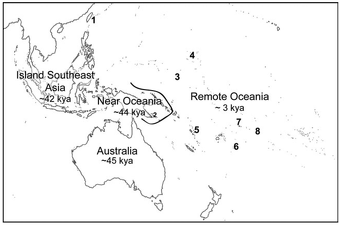 Modern humans reached Australia by at least 55,000 B.C. which implies some degree of water crossing. There is evidence that New Guinea was continuously occupied by indigenous Papuans beginning 40,000 years ago, and the Solomon Islands was continuously occupied by indigenous Papuans at least 30,000 years ago. The rest of Melanesia and Polynesia — the main areas of the western and central Pacific Ocean — was occupied later at different times.