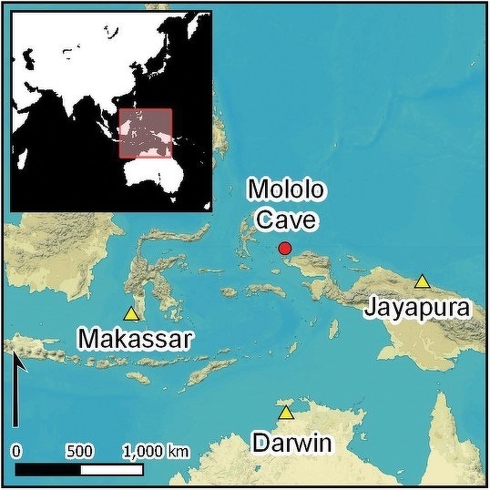Location of Mololo Cave: Evidence from Mololo Cave on Waigeo Island in the Raja Ampat archipelago of West Papua, Indonesia — between North Maluku Island in Indonesia and northeast New Guinea — indicates that early seafarers navigated to the island at least 55,000 years ago;Archaeologists unearthed stone artifacts, animal bones from marsupials, megabats, and ground-dwelling birds and the oldest known plant artefact outside Africa—a carved tree resin object likely used as fuel — attesting to human occupation in the cave at that early date [Source: Archaeology magazine, November-December 2024] image: Cosmos magazine