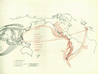 According to the “Encyclopedia of World Cultures”: “The Catholic church, through the Agreement of Tordesillas in 1491, divided the world (arrogantly) at a line 370 leagues west of the Cape Verde Islands; all to the west "belonged to" Spain, with Portugal's domain encompassing that half of the globe east of the line. Thus was set in motion Spain's voyages to the Western Hemisphere in search of spices and gold and its discovery of the New World in the process. [Source:“Encyclopedia of World Cultures, Volume 2: Oceania,” edited by Terence E. Hays, 1991 |~|]