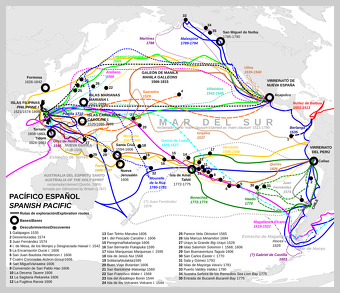 From 1565 to 1815, a Spanish transpacific route known as the Manila galleons regularly crossed from Mexico to the Philippines and back, exchanging Mexican silver for spices and porcelain.. Spanish power dominated the American side of the Pacific Ocean, controlling an area stretching thousands of kilometers from Mexico to Chile. The vast central Pacific was visited only by the Manila galleons and an occasional explorer. Until the time of Captain James Cook the Manila Galleons were the only large ships to regularly cross the Pacific. The route was purely commercial and there was no exploration of the areas to the north and south. In 1668, the Spanish founded a colony on Guam as a resting place for west-bound galleons. For a long time this was the only non-coastal European settlement in the Pacific.