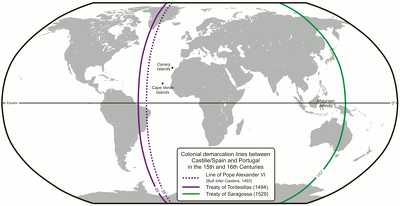 The treaty modified an earlier division proposed by Pope Alexander VI. The other side of the world was divided by the Treaty of Zaragoza, signed on April 22, 1529, which specified the antimeridian to the line of demarcation specified in the Treaty of Tordesillas. The line dividing Spanish and Portuguese territory ran 370 leagues west of the Cape Verde islands on the Atlantic side (46̊longitude) and 134̊ longitude on the Asian side, but nobody knew exactly where that was. With the Treaty of Zaragosa in 1529, the Portuguese paid Emperor Charles V of Spain 350,000 gold ducats (a huge sum of money at that time) to gain possession sole of the Spice Islands. When chronometers were invented they showed that the land was in fact on the Portuguese side anyway. [Source: Merle Severy, National Geographic, November 1992]