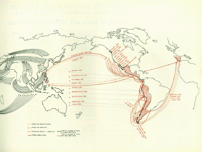 Magellan sailed the Pacific for Spain (Castile) . After crossing the Pacific Ocean one surviving ship returned west across the Indian Ocean and the other went north in the hope of finding the westerlies and reaching Mexico. Unable to find the right winds, it was forced to return to the East Indies. . In 1565 (44 years later), Andrés de Urdaneta found a wind system that would reliably blow a ship eastward back to the Americas.