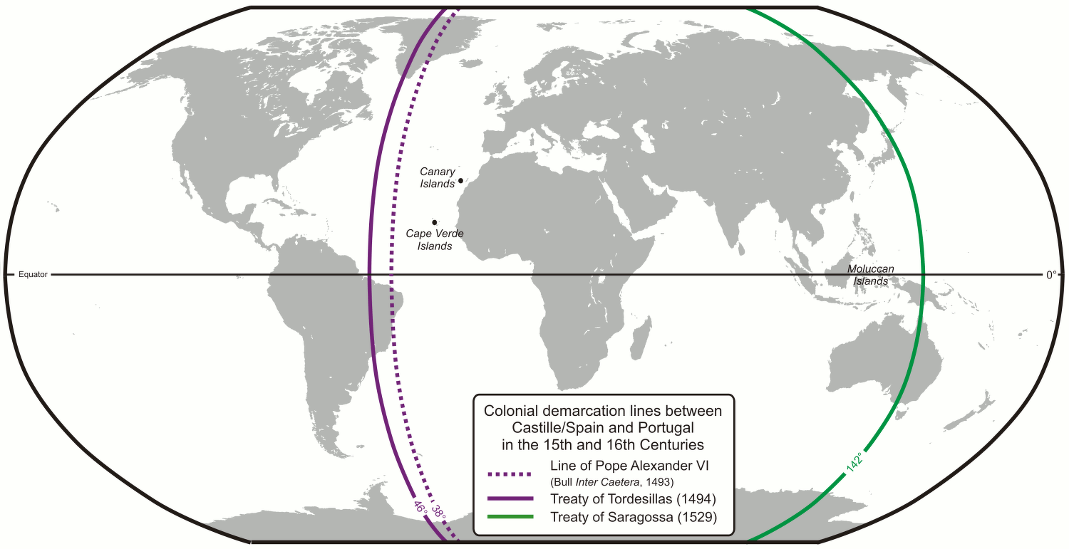 The Treaty of Tordesillas, was signed in Tordesillas, Spain, on June 7, 1494, two years after Columbus “discovered” America, and was ratified in Setúbal, Portugal. It divided the newly discovered lands outside Europe between the Portuguese Empire and the Spanish Empire (Crown of Castile). The line of demarcation was about halfway between the Cape Verde islands (already Portuguese) and the islands visited by Christopher Columbus on his first voyage (claimed for Castile and León), named in the treaty as Cipangu and Antillia (Cuba and Hispaniola). [Source: Wikipedia]