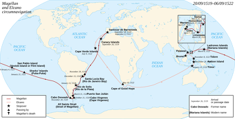 The route of the Victoria, which completed the world's first recorded circumnavigation over about 3 years