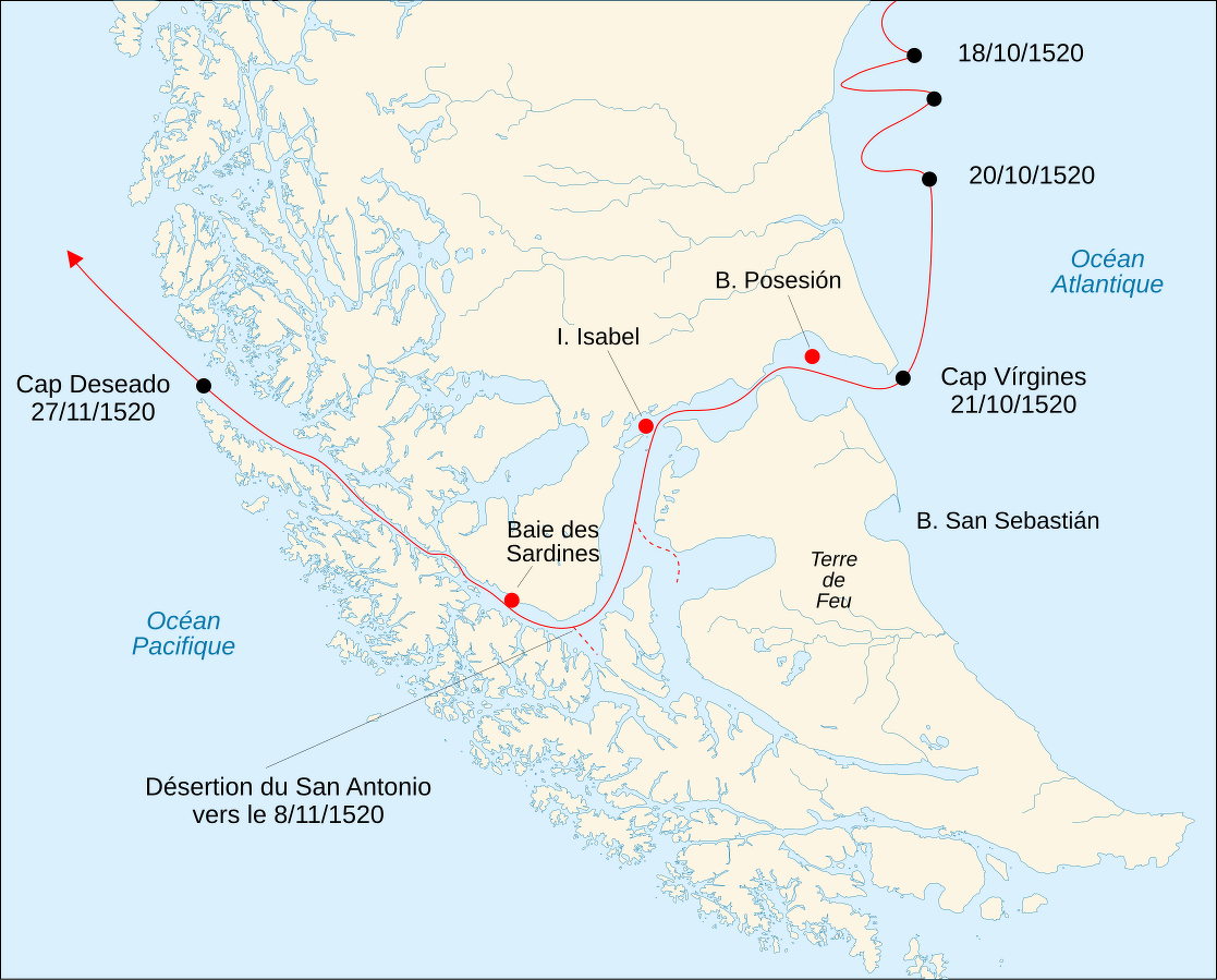 At the Río de la Plata, a large bay or marginal sea of the Atlantic Ocean near present-day Buenos Aires, Argentina, Magellan thought he found a passage to the Pacific Ocean. But realized that was not the case after tasting the water and finding it was not very salty. After investigating several bays and rivers that turned out to be dead ends, Magellan decided the spend the South American winter of 1520 in St. Julian Bay, located about 1,100 kilometers (700 miles) south Buenos Aires.