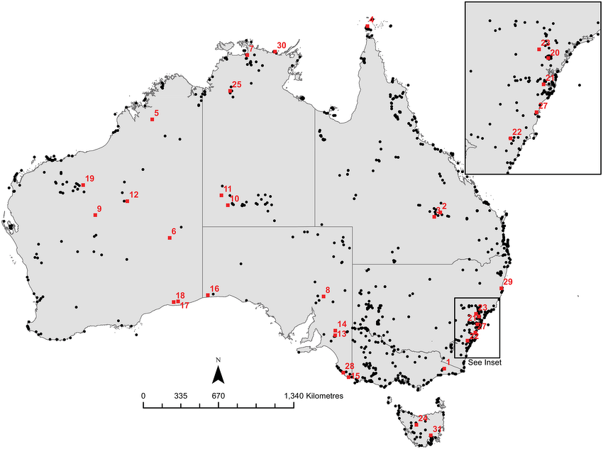 Some archaeological sites that existed 12,000 years ago: 1) New Guinea II Rockshelter; 2) Kenniff Cave; 3) Native Wells rockshelters; 4) Dabangay shell mounds; 5) Carpenters Gap 1 Rockshelter; 6) Puntutjarpa Rockshelter; 7) Malangangerr Rockshelter; 8) Arkaroo Rock; 9) Serpents’ Glen Rockshelter; 10) Glen Thirsty Well; 11) Puritjarra Rockshelter; 12) Bush Turkey 3 Rockshelter; 13) Devon Downs Rockshelter; 14) Roonka Flat Dune open site; 15) Koongine Cave; 16) Allen’s Cave; 17) Madura Cave; 18) Norina Cave; 19) Marillana A Rockshelter; 20) Loggers Shelter; 21) RTA G1; 22) Sassafras 1 Rockshelter; 23) Yengo 1 Rockshelter; 24) Warragarra Rockshelter; 25) Nimji Rockshelter; 26) Skew Valley midden; 27) Hooka Point midden; 28) Canunda Rocks midden; 29) Clybucca midden; 30) Muyu-ajirrapa midden; 31) Jordan River midden from Researchgate
