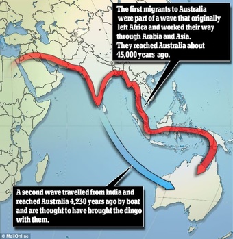 Ancient Indians migrated to Australia and mixed with Aborigines 4,000 years ago, bringing the dingo's ancestor with them, according to research from 2013. Rosie Mestel wrote in the Los Angeles Times: When modern humans left Africa as far back as 70,000 years ago, they dispersed across the world, reaching Australia at least 50,000 years ago. From then until the 18th-century arrival of European colonists, aboriginal Australians did not mix their DNA with anyone else in the world — or so many scientists believed. Now a study has turned up evidence of much more recent interbreeding between native Australians and people who came from India. The findings, based on a detailed examination of the DNA of aboriginal Australians and hundreds of people of other pedigrees, found that mixing occurred as recently as 4,200 years ago. See Below [Source: Rosie Mestel, Los Angeles Times, January 14, 2013]