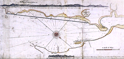 hand-drawn chart of Gaspé Bay, Canada made by Cook in 1758, soon after he learned surveying;a year later it became the first chart of Cook's to be engraved and printed