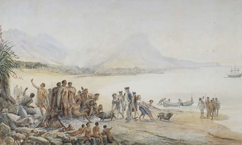 A painting depicting the landing of Captain Cook in New Zealand in 1769, National Library of Australia