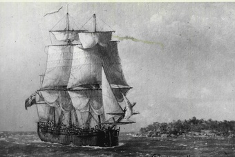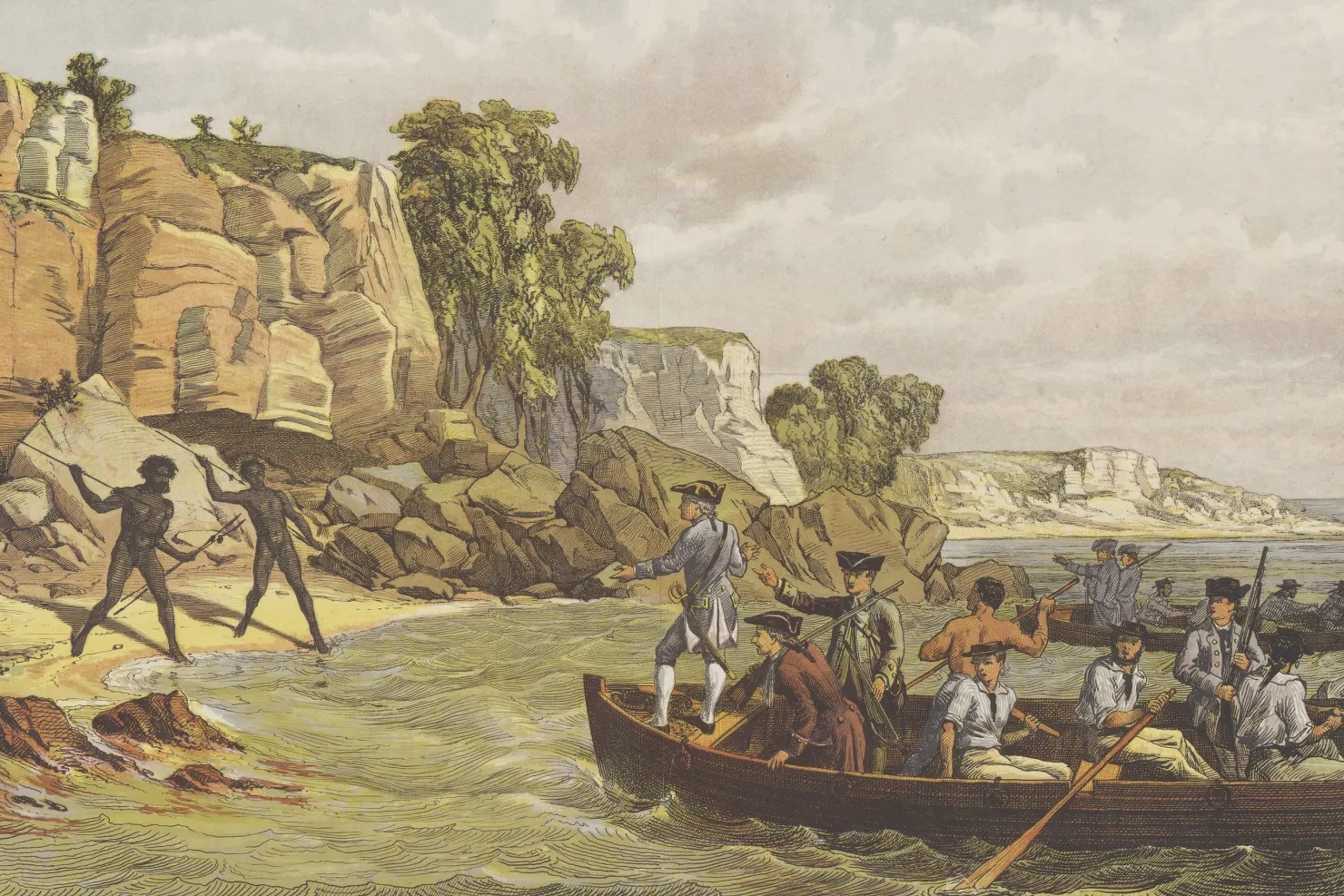 On Cook’s first voyage, Endeavour followed the east coastline of Australia northwards, keeping the land in sight with Cook charting and naming landmarks as he went. Cook and crew made their first landfall in Australia at a beach now known as Silver Beach on Botany Bay (Kamay Botany Bay National Park). Two Gweagal men of the Dharawal, Eora Aboriginal groups opposed their landing and in the confrontation one of them was shot and wounded. [Source: Wikipedia]