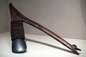 According to the Metropolitan Museum of Art: This object is one of the most important types of valuables that still circulate in the area. The axe has a greenstone blade and a carved wooden haft. The axe blade is inserted into the wooden handle, carved in the shape of a slightly tilted forward ‘7’. The blade is made of polished ignimbrite stone sourced in one of the few volcanic islands of the Massim region. It is fitted into the previously slit axe’s head and wrapped with fibers fastened around the incision to secure the blade in position. The axe shaft is made of red hardwood; it is flat in shape and follows an acute angle, with the stone head close to the body of the handle. The haft is carved in bas-relief with a serpentine motif known as mwata, a mythical snake. The mwata descends from the pointed tip where the blade and the shaft meet towards the center of the handle where it ends in a coiled loop pattern, leaving the rest of the haft undecorated except for the axe’s knob at the very bottom. Here, the handle has been cut in the shape of a stylized open mouth characteristic of Massim carvings.