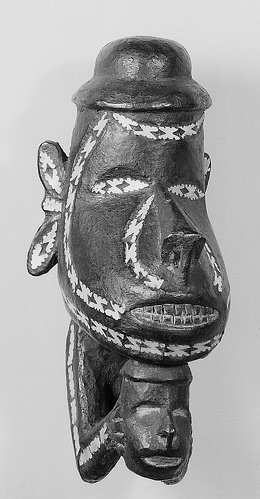 Ritual staffs were produced in the Trobriand Islands, but they appear to have been primarily employed in the southern Massim region, where they were used in some areas for healing rites and in others for malevolent magic. The tops of the staffs were typically adorned with one or two seated figures. These human images, like those on the lime spatulas, may have served as the temporary residing places for spirits-in this case, for spirits who assisted the religious specialist in the rites. Delicately rendered, with her hands clasped in front of her chest and her head bowed as if in deep thought, the subject of this intimate work appears as if preoccupied with spiritual matters. However, her identity and significance remain unknown.