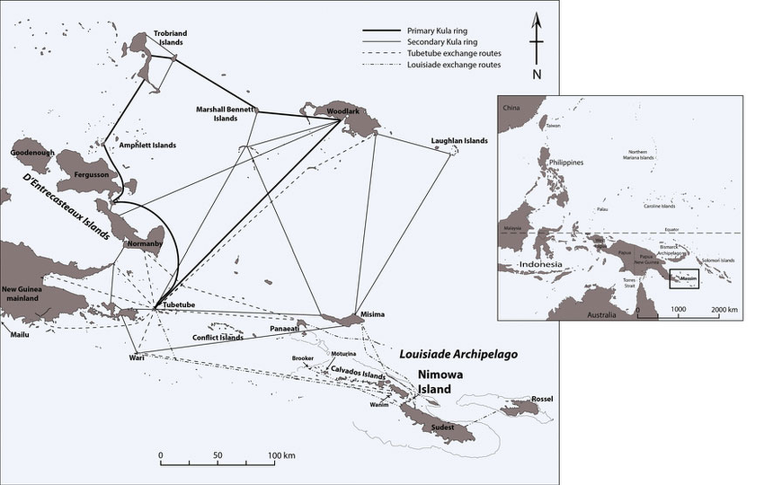 Eric Kjellgren wrote: By far the most important trading activity in the Massim is the kula, a complex system of exchange relationships between individuals on different islands, through which ceremonial valuables in the form of necklaces and armbands continually circulate. Success in the kula, which remains vigorous today, is the primary means through which an individual achieves wealth and renown. The participants, valuables, and vessels involved in the kula are surrounded by rituals, restrictions, and magic intended to ensure a safe voyage and success in obtaining the most coveted examples of the valuables. The accumulation, exchange, and display of ceremonial valuables formed, and continues to form, one of the central themes in the arts and cultures of the Massim region. Many types of Massim valuables consist of exaggerated versions of ordinary objects — such as armbands or implements-which are too large, too small, too fragile, or too ornate for practical use. [Source:Eric Kjellgren, “Oceania: Art of the Pacific Islands in The Metropolitan Museum of Art”, 2007]