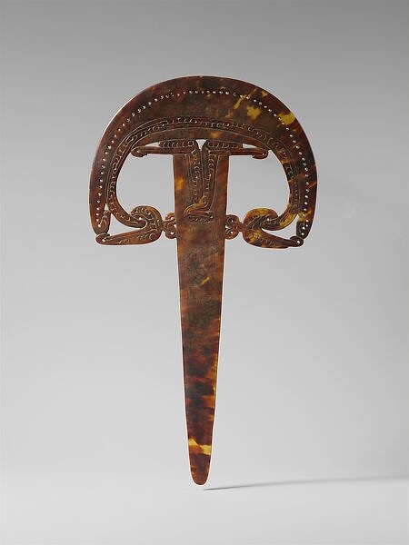 Original decorations would have included small flat disks made from red Spondylus shells sewn together through the spatula’s perforations around the perimeter of the crescent-shaped handle. The inner part of the curved handle is incised with interlocking scroll patterns. Its extremities bend towards the shaft and are attached to it through two curvilinear motifs carved out of the turtle shell to each side of the shaft. Two stylized bird heads, incised with long, straight beaks facing away from each other, separate the top part of the shaft from the center of the crescent handle.