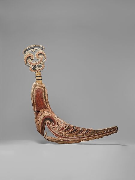 Massim artists produce two basic forms of kula canoes and prows. Canoes with the distinctive rising-crescent-shaped prow ornament seen here, referred to in the Trobriand Islands as nagega, are produced in man parts of the region. The present work is attributed to the southern Massim island of Suau. According to Cecil Abel, a southern Massim man and leading authority on the region's art, canoes on Suau were sacred objects associated with the ancestors.
