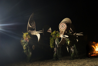 According to the Metropolitan Museum of Art: The dramatic bark cloth kavat masks created by Central Baining peoples are used exclusively in the night dance, a nocturnal performance lit by firelight. The Central Baining practice both day dance and night dance rites. The day dance, accompanied by an orchestra of women, is devoted to female fertility, agriculture, and the mourning of the dead, phenomena typically associated with the community.