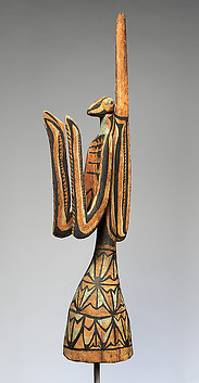 Eric Kjellgren wrote: The headdress was originally painted in vivid blue, black, and reddish pigments, which have since faded to subtler hues; the underside is hollowed out to allow it to be worn on top of the head like a helmet. The headdress portrays a praying mantis (kovio), an insect that may have served as a clan emblem, alert and poised as if to strike. [Source: Eric Kjellgren, “Oceania: Art of the Pacific Islands in The Metropolitan Museum of Art”, 2007]