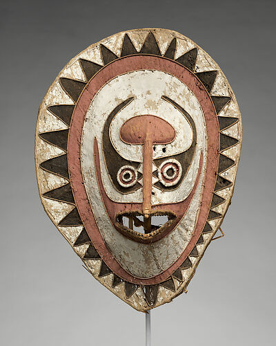A Mask (Kavat) in the Metropolitan Museum of Art collection was made by the Kairak Baining people from barkcloth, bamboo, and paint. Dating to the 1973, it originates from Papua New Guinea, New Britain and is 54 inches high, with a width of 30 inches and a depth of 14 inches (137.2 x 76.2 x 35.6 centimeters)
