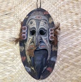 The Biwat (Mundugumor) people of the Lower Sepik River are well-known for masks.Eric Kjellgren wrote: In the past, Biwat carvers produced numerous forms of masks. Although there is almost no information on the specific identity and uses of individual examples, masks, like other forms of sculpture, appear to have portrayed the two major types of supernatural beings in Biwat cosmology: maindjimi, or forest spirits, who lived in the woods surrounding the village, and saki, or water spirits, who inhabited rivers and other bodies of water. ' One Biwat mask likely represents a water or crocodile spirit. In the village of Kambrambo masks of this these pe appeared as the heads of human Iike figures who rode on the backs of gigantic effigies representing the "crocodile mother," who swallowed and later disgorged young novices as part of initiation ceremonies.[Source: Eric Kjellgren, “Oceania: Art of the Pacific Islands in The Metropolitan Museum of Art”, 2007. Eric Kjellgren is a leading scholar of the arts of Oceania. Formerly curator of Oceanic Art at The Metropolitan Museum of Art and director of the American Museum of Asmat Art (AMAA) and Clinical Faculty in Art History at the University of St. Thomas in Minnesota, he has worked extensively with contemporary Indigenous Australian artists and done field research in Vanuatu]