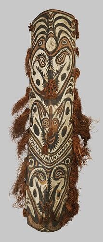 According to Beta Omang, a Biwat man from Akuran village, the faces on the shields depict Ra ram, a powerful spirit, and the bristlelike elements around the eyes represent spears (damvro). Another type of face with round eyes, which appears at the top of some shields, represents the ftying fox, a large species of fruit bat. The imagery of the present Angoram shield is closely similar to that of the Biwat example described by Omang. Although there is no precise information on the interpretation of shield imagery among the Angoram, it seems reasonable to suppose that the present work depicts the same, or similar, beings that appear on Biwat shields. Given the hazards and uncertainties of combat, the addition of such powerful spirit images to war shields may have been intended to afford the bearer an added measure of supernatural protection.