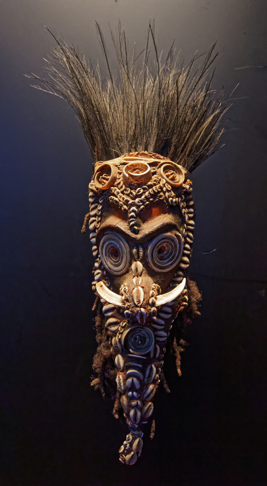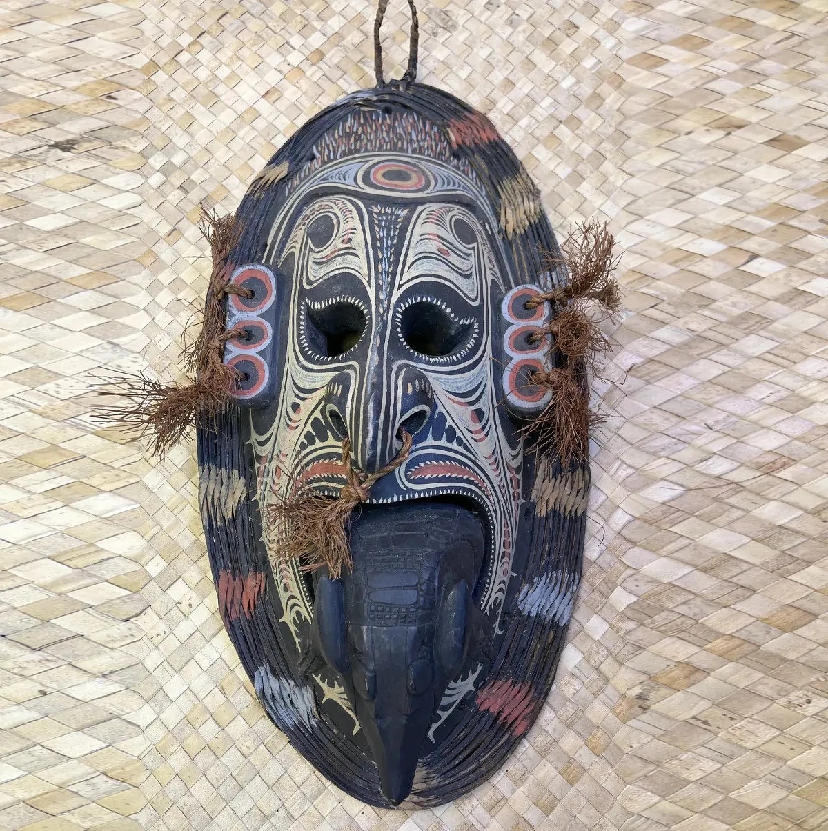 A late 19th-early 20th century flute mask made of wood, paint, fiber and seeds by the Kopar people of the lower Sepik region is 15.6 feet (4.76 meters) tall. The Kopar people, who live along the lower reaches of the Sepik River. Masks like this one, lacking eyeholes and with a shallow, concave back far too small to accommodate a human face, served as ornaments for sacred flutes.