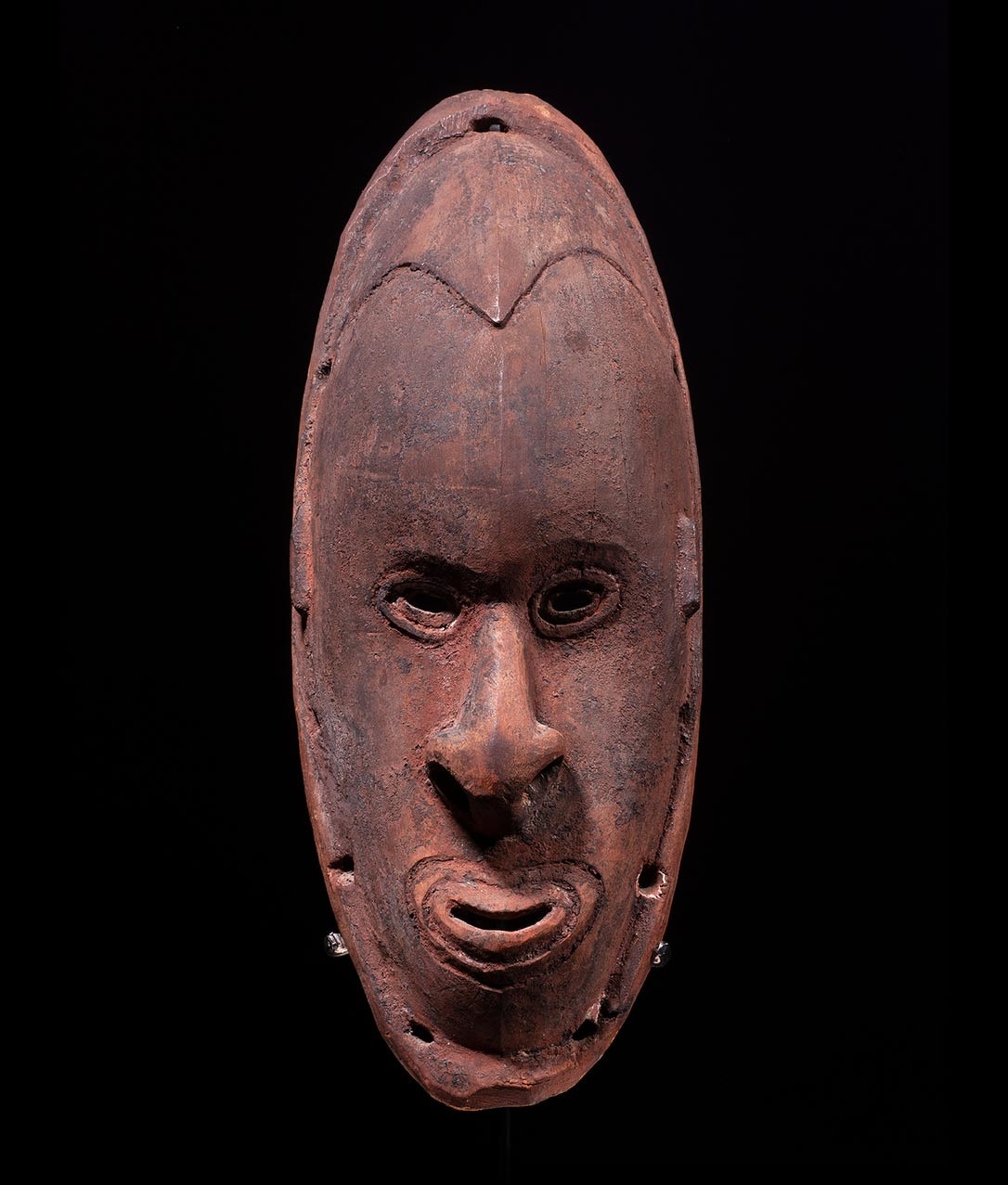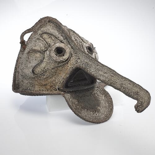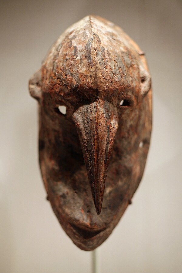 Masks with extremely long and thin noses occur widely throughout the lower Sepik region, where they are predominantly depictions of powerful spirits. Carvers among the Murik people state that these elongated noses are explicitly modeled after the beaks of birds. These beak-shaped noses find their supreme expression in the Kopar masks in which the facial features are almost entirely condensed into an enormous spikelike nose, with a small oval eye on either side. Some examples are crowned, as here, by a small bird, possibly an eagle, which may represent a totemic species.