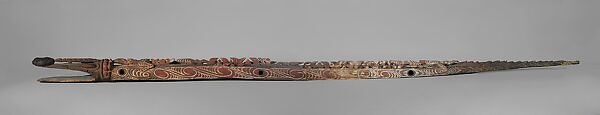 The Metropolitan Museum of Art collection contains a Sawos Ceremonial Board (Malu) made of wood. Dating to the 19th century, it originates from the Middle Sepik River region and is 75 inches high, with a width of 24 inches and a depth of 6.5 inches (190.5 x 61 x 16.5 centimeters)