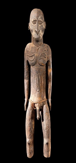 According to the Metropolitan Museum of Art: The ancient wood sculptures of the Inyai-Ewa and neighboring groups of the upper Korewori River, a southern tributary of the Sepik, are the earliest Melanesian woodcarvings to survive in any substantial numbers. Kept in rock shelters, which protected them from the elements, the figures were primarily created between the sixteenth and nineteenth centuries. They occur in several forms and portray a variety of supernatural beings. Broad, flat female images are, at times, identified as representations of two primordial sisters who helped to shape the world or as the female ancestors or founders of particular clans. Two-legged male figures also likely portray primordial clan ancestors. The most abundant Inyai-Ewa carvings are the one-legged male figures, known as aripa. Kept in the men’s ceremonial house during the owner’s life and placed in a rock shelter as a memorial after his death, aripa represented spirits that resided within the images and served as hunting helpers, aiding in the capture of game such as wild pigs and cassowaries (large ostrich-like birds). Two-legged images probably portray primordial male beings associated with the village clans. As in the one-legged hunting-helper figure,, the elaborate openwork carving in the torso depicts the internal organs.